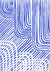 Dieses abstrakte Gemälde zeigt wellenförmige und gerade blaue Linien auf weißem Hintergrund, wodurch ein Muster aus verschiedenen gebogenen und linearen Formen entsteht.