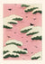 Eine Kunstposter im traditionellen japanischen Stil mit einem rosa Himmel, sanftgrünen Wolken und mehreren schwarzen Vögeln, die dazwischen fliegen.