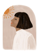 Dieses abstrakte Gemälde zeigt eine Posterillustration einer Frau mit kurzgeschnittenem Haar im Seitenprofil, geschlossenen Augen, die die Wärme einer grellen Sonne vor einem gedämpften beigen Hintergrund genießt. Sie trägt ein weißes Top.