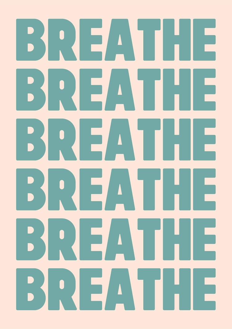 Dieses zeitlose Gemälde strahlt Ruhe aus mit dem wiederholten Wort „Breathe“ auf einem hellrosa Hintergrund, in auffälligem Türkis. Eine beruhigende Ergänzung für jeden Raum.