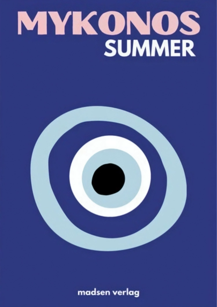 Dieses Gemälde fängt die sommerliche Atmosphäre mit dem Titel "Mykonos Summer" in strahlend weißen Buchstaben auf einem tiefblauen Hintergrund ein, begleitet von einem abstrakten Design, das die Fantasie anregt.