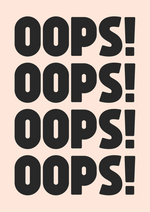 Dieses verspielte Gemälde wiederholt das Wort „OOPS!“ viermal in fetten, schwarzen Großbuchstaben auf einem charmanten hellrosa Hintergrund. Eine lustige und verspielte Ergänzung für jeden Raum!
