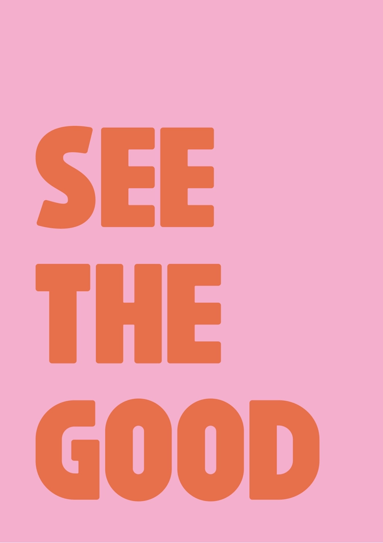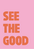 Dit inspirierende Gemälde auf rosa Hintergrund strahlt Positivität aus mit dem auffälligen, orangen Text 'SEE THE GOOD'. Das einfache, klare Layout betont die Kraft des Optimismus.