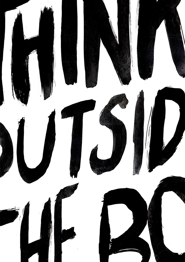 Dieses Gemälde mit dem Text "Think Outside The Box" in kräftigen schwarzen Buchstaben, gemalt in einem auffälligen Pinselstrichstil auf einem hellen weißen Hintergrund, inspiriert Kreativität und Innovation.