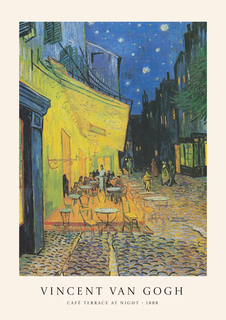 Dieses Gemälde zeigt eine Terrasse bei Nacht mit Tischen, Stühlen und Menschen unter einem Sternenhimmel, beleuchtet von der warmen Beleuchtung des Cafés.