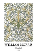 Dieses Gemälde von William Morris, 'Harebell' aus dem Jahr 1875, zeigt ein bezauberndes Muster aus stilisierten Blättern und Blumen in lebendigen grünen und hellblauen Tönen auf einem klaren weißen Hintergrund.