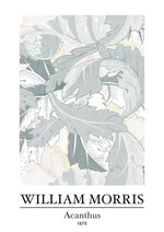 Dieses Gemälde mit dem Titel 'Acanthus' von W. Morris zeigt eine stilisierte Darstellung von hellgrauen und grünen Acanthusblättern, präsentiert in einer feinen, ausgewogenen Komposition.