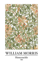 Dieses Gemälde mit dem Titel "Honeysuckle", entworfen von William Morris im Jahr 1885, zeigt ein botanisches Muster mit Geißblatt-Ranken, grünen Blättern und orange-rosa Blüten auf hellem Hintergrund.