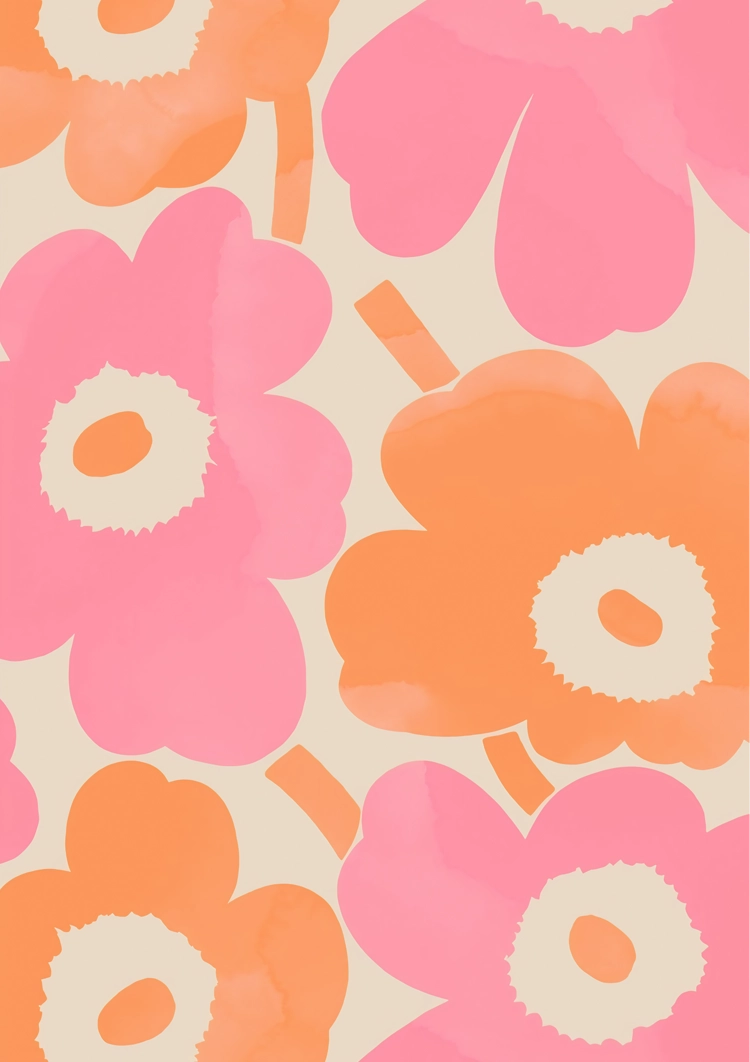 Dieses Gemälde zeigt große, stilisierte Blumen in lebendigen Orange- und Rosatönen mit weißen Mittelpunkten, die auf einem sanften, blassen Hintergrund schweben. Eine moderne und ansprechende Interpretation der Natur.