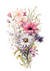 Dieses Gemälde zeigt eine Aquarellillustration eines Straußes mit Gänseblümchen, Mohnblumen und anderen Wildblumen in Rosa, Lila, Weiß und Gelb.