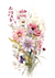 Dieses Gemälde zeigt eine Aquarellillustration eines Straußes mit rosa, lila, gelben und blauen Blüten, mit grünen Blättern und Stängeln.