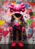 Dieses Gemälde zeigt eine Figur mit einem großen, rosa Kopf und einem Körper, der mit mehrfarbiger Farbe bespritzt ist.
