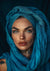 Dieses Gemälde zeigt eine orientalische Frau mit blauen Augen und Gesichtstattoos, gehüllt in ein blaues Kopftuch, das ihr Haar bedeckt. Ihr intensiver Blick und ihre Sommersprossen verleihen ihrem geheimnisvollen Aussehen Charakter.