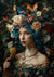 Dieses Gemälde zeigt eine Frau mit blauem, lockigem Haar und roten Lippen, mit einem Blumenkranz und Vögeln auf ihrem Finger vor einem detaillierten Hintergrund mit Naturthema.