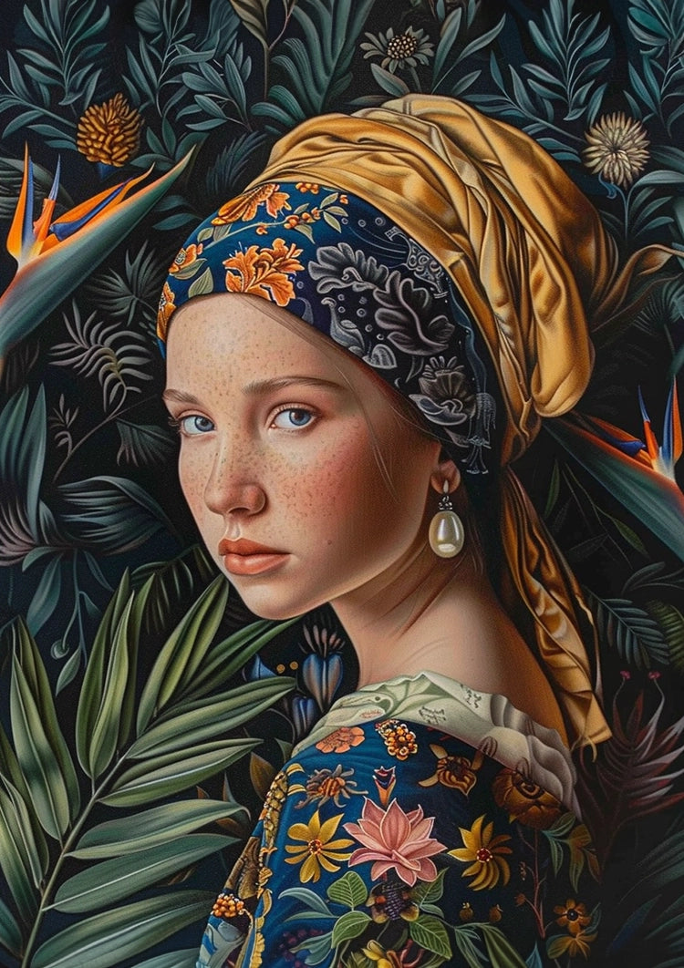 Dieses Gemälde zeigt eine junge Frau mit heller Haut und roten Haaren, gekleidet in ein geblümtes Kleid und ein gelbes Kopftuch mit einem Perlenohrring vor einem dunkelgrünen Hintergrund.