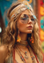 Dieses Gemälde zeigt eine Frau mit langem, welligem Haar, einer großen runden Sonnenbrille, einem dekorativen Stirnband sowie mehreren Halsketten und Ohrringen mit bunten Perlen vor einem verschwommenen Hintergrund.