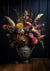 Dieses Gemälde zeigt ein wunderschönes Blumenarrangement in einer dekorativen Vase, mit einer Mischung aus getrockneten und frischen Blumen in Gelb-, Rosa- und Orangetönen. Das Ganze steht auf einer Holzoberfläche vor einem dunklen, strukturierten Hintergrund, was den Kontrast und die Lebendigkeit der Blumen betont.