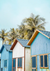 Ein Gemälde mit drei bunten Häuschen und dahinter Palmen.