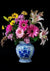 Gemälde einer blau-weißen Porzellanvasen mit einem bunten Blumenarrangement. Rosa Gerbera, gelbe Gänseblümchen, weiße Lilien und hellrosa Blumen leuchten vor einem schwarzen Hintergrund.