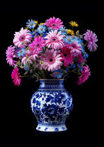 Gemälde einer blau-weißen Keramikvase, gefüllt mit einem großen, lebendigen Blumenstrauß. Rosa Gerbera-Gänseblümchen, blaue und weiße Gänseblümchen und andere Blumen strahlen wunderschön vor dem schwarzen Hintergrund.