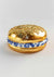 Gemälde eines goldenen Hamburgerbrötchens mit einem Delfter Blau-Burger in der Mitte. Dieser einzigartige Kontrast macht das Ganze zu einem auffälligen Kunstwerk.