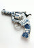 Gemälde einer Revolver, verziert mit komplizierten blauen Blumenmustern auf weißem Hintergrund. Dieses dekorative Design verleiht der Schusswaffe ein porzellanartiges Aussehen.