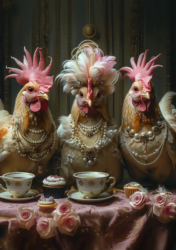 Auf diesem Gemälde sehen Sie drei Hühner in schicken Outfits und Accessoires, die an einem Tisch mit Tee, Cupcakes und Rosen genießen. Der üppige Hintergrund schafft eine elegante Atmosphäre, wie bei einer High Tea Party.