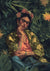 Auf diesem Gemälde sehen Sie ein gemaltes Porträt einer entspannten Person mit geschlossenen Augen, umgeben von Vegetation und Blumen. Sie trägt einen grünen Schal mit Blumenmuster, ein rosa Top, eine blaue Hose und ein Haarband mit Blumen.