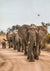 Dieses Gemälde zeigt eine Herde Elefanten, einschließlich Kälber, die auf einem unbefestigten Weg in einer natürlichen Umgebung mit klarem Himmel über ihnen laufen.