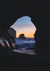 Ein Gemälde durch einen Felsen hindurch mit Blick auf das Wasser und einen anderen Felsen.
