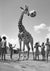 In diesem Gemälde sieht man eine Giraffe, die fröhlich mit einer Gruppe von Kindern Fußball spielt, eine charmante und unerwartete Szene voller Verspieltheit und Staunen.