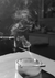 Schwarz-weißes Gemälde eines Aschenbechers, in dem eine Zigarette liegt, aus der Rauch aufsteigt.