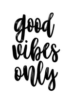 Dieses fröhliche Gemälde mit dem Text "Good vibes only" in einer entspannten, fließenden Handschrift bringt eine positive Atmosphäre in jeden Raum. Eine stilvolle Erinnerung an Optimismus und Güte.