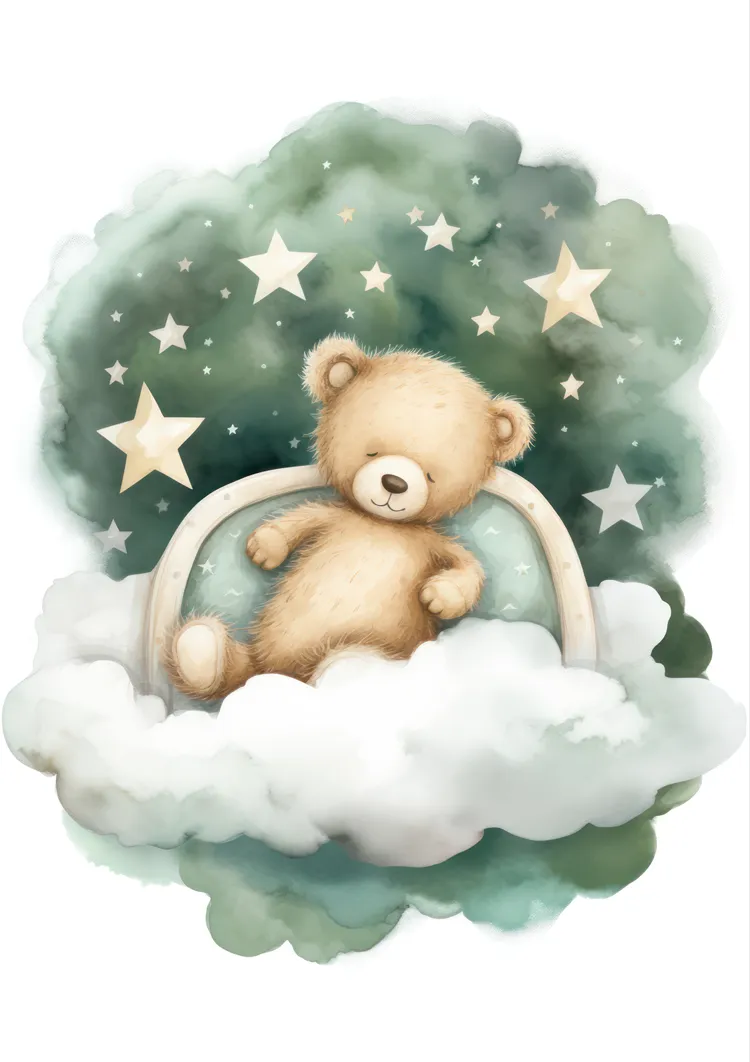 Dieses bezaubernde Gemälde zeigt einen niedlichen Teddybären, der auf einem halbmondförmigen Kissen ruht, umgeben von weichen Wolken. Der Hintergrund, ein funkelnder Sternenhimmel mit verstreuten Sternen, verleiht einen magischen Touch.