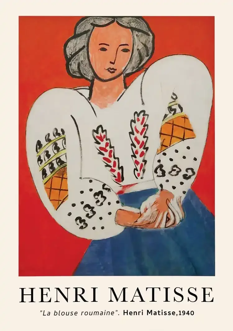 In diesem Gemälde von Henri Matisse aus dem Jahr 1940, mit dem Titel "La Blouse Roumaine", sehen wir eine Frau mit grauem Haar, gekleidet in eine traditionelle rumänische Bluse mit wunderschönen Mustern, vor einem lebendigen roten Hintergrund.