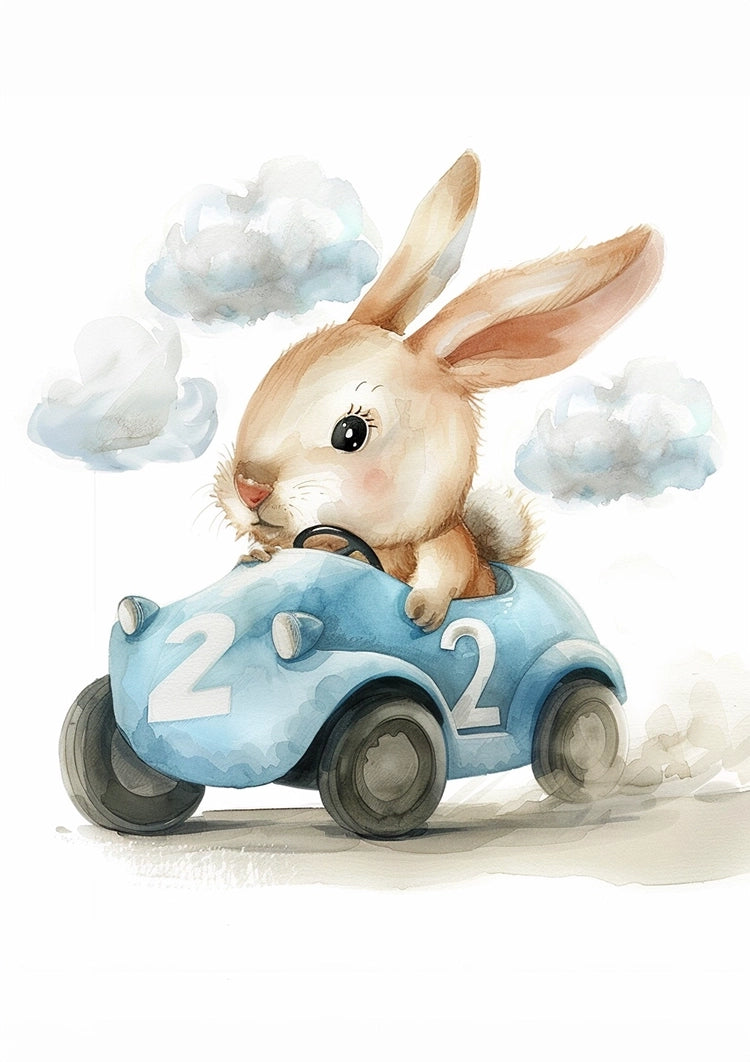 Dieses Gemälde zeigt ein Kaninchen, das ein kleines blaues Rennauto mit der Nummer 2 darauf fährt. Das Kaninchen wirkt konzentriert, während es fährt.