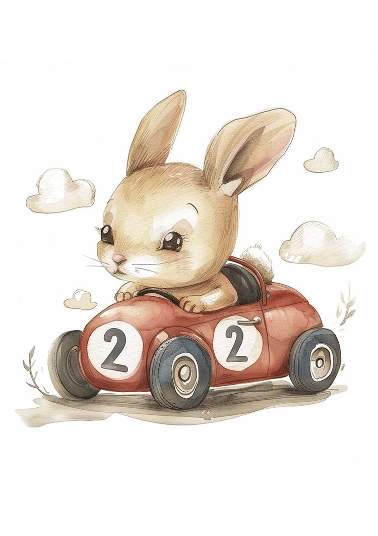 Dieses Gemälde zeigt ein Kaninchen, das ein kleines rotes Rennauto mit der Nummer 2 darauf fährt. Das Kaninchen wirkt konzentriert, während es fährt.