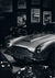Dieses Gemälde zeigt einen klassischen Aston Martin, der in einer schlecht beleuchteten Garage geparkt ist, mit Vintage-Grand-Prix-Postern von Monaco an den Wänden und einem Motorrad im Hintergrund.