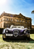 Dieses Gemälde zeigt einen vintage lila MF4 Sportwagen, der vor einem großen steinernen Herrenhaus unter einem klaren Himmel geparkt ist.