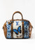 Gemälde einer Tasche mit braunen Lederakzenten und doppelten Griffen. Das zentrale Design zeigt blaue und weiße Schmetterlings- und Blumenmuster, mit befestigten blauen und braunen Schmetterlingen sowie einem auffälligen blauen 'LV'-Logo.
