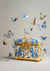 Dieses Gemälde zeigt einen wunderschönen Koffer, dekoriert mit blauen Blumen und goldenen Akzenten, umgeben von einem Schwarm bunter Schmetterlinge, die durch die Luft tanzen. Der Koffer, mit einem eleganten Griff und feinen goldenen Details, steht im Mittelpunkt vor einem ruhigen Hintergrund.