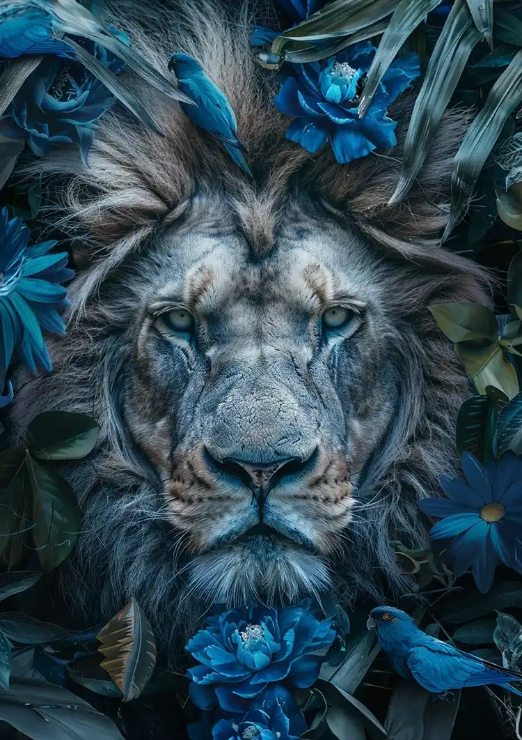 Dieses Gemälde zeigt das Gesicht eines Löwen, umgeben von blauen Blumen und Blättern, während kleine blaue Vögel auf den Pflanzen sitzen. Der ruhige Ausdruck des Löwen blickt den Betrachter direkt an und fängt so einen friedlichen und majestätischen Moment in der Natur ein.