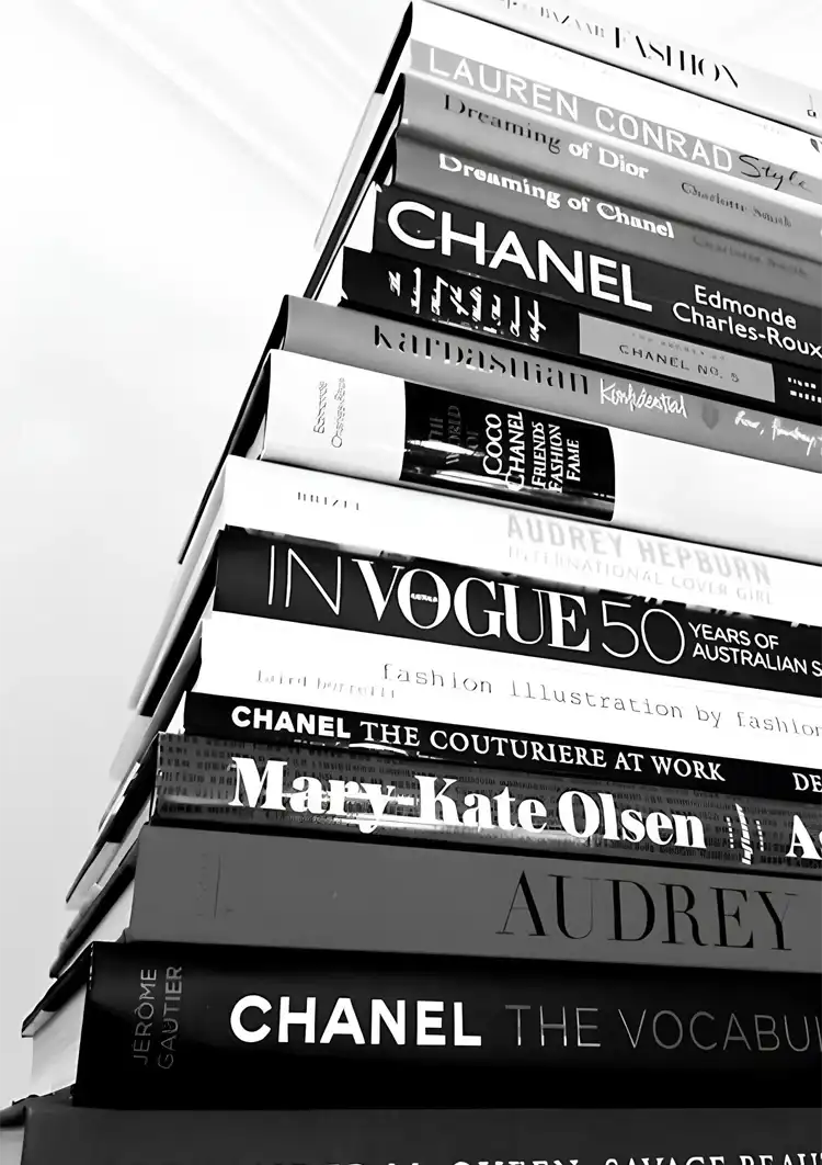 Ein schwarz-weißes Gemälde eines Stapels modebezogener Bücher mit Markennamen wie Chanel und Dior, zusammen mit Titeln über bekannte Modefiguren und Kunstzeitschriften.