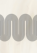 Ein monochromes Gemälde mit einem sich wiederholenden Wellenmuster, das aus mehreren schwarzen Linien auf einem strukturierten, gebrochen weißen Hintergrund besteht. Die Linien erzeugen ein fließendes, ununterbrochenes wellenförmiges Design.