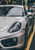 Dieses Gemälde zeigt eine Nahaufnahme eines Nardo-grauen Porsche 718, der in einer belebten Straße geparkt ist, mit klaren Details des schlanken Designs und der runden Scheinwerfer. Der Hintergrund zeigt unscharfen Stadtverkehr.