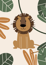 Dieses Gemälde zeigt eine Illustration eines niedlichen Löwen mit brauner Mähne, der ruhig auf einem hellen Hintergrund sitzt. Das Bild hat große grüne und orangefarbene tropische Blätter in den Ecken, die einen Rahmen mit einem Naturthema um den Löwen bilden.