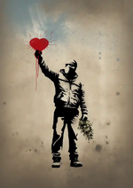 Dieses Gemälde zeigt ein Graffiti-Kunstwerk im Schablonenstil mit einer Person mit Kapuze, die in der einen Hand einen Ballon hält.
