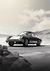 Dieses Gemälde zeigt ein Schwarzweißfoto eines klassischen 911, der in einer offenen, flachen Landschaft mit felsigem Gelände im Vordergrund und bewölktem Himmel im Hintergrund geparkt ist. Das Auto hat ein schlankes Design und runde Scheinwerfer.