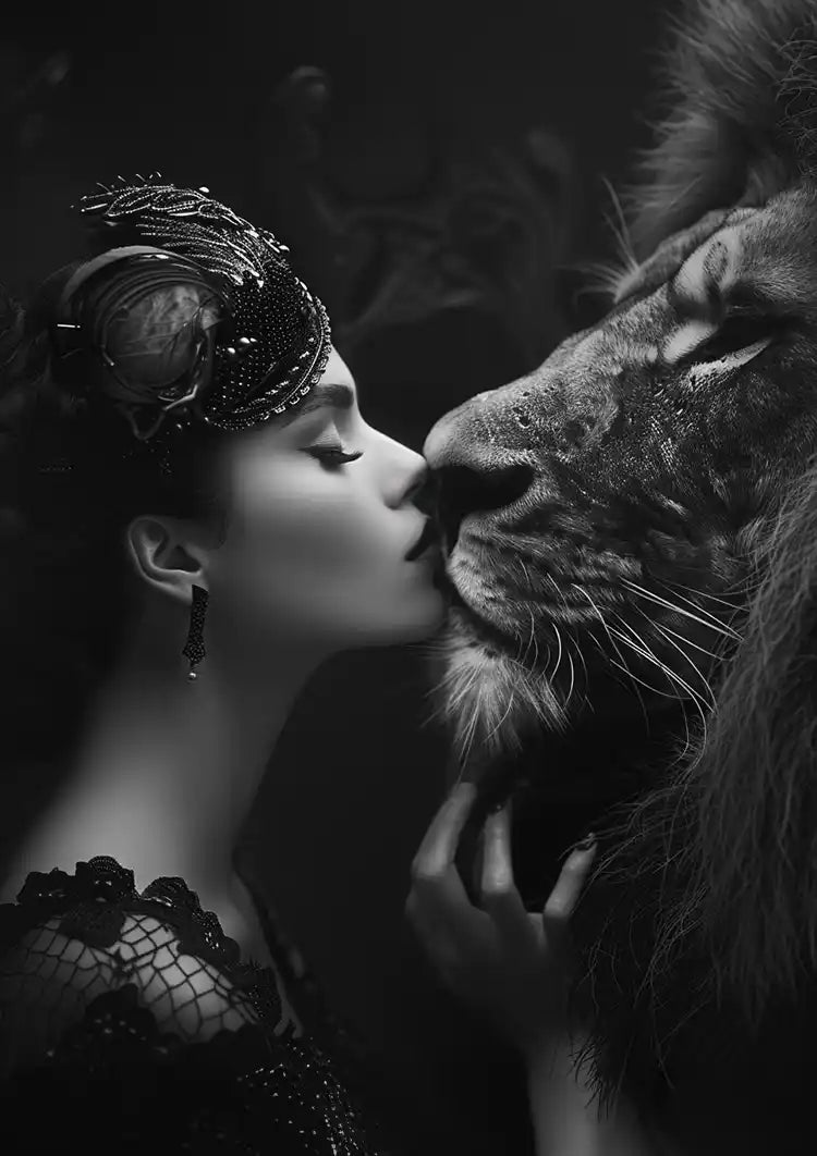 Dieses Gemälde zeigt eine Frau, gekleidet in Spitze und mit einer Kopfbedeckung mit Perlen, die liebevoll die Nase eines Löwen berührt, während ihre Hand auf seinem majestätischen Gesicht ruht. Das Bild fängt einen intimen und friedlichen Moment zwischen Mensch und Tier ein.