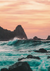 Ein Gemälde eines wilden Meeres mit Wasser, das gegen die Felsen schlägt.